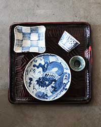 骨董:古伊万里手寸皿、市松蕎麦猪口 現代作家:杉本太郎さんの長角皿、豆皿